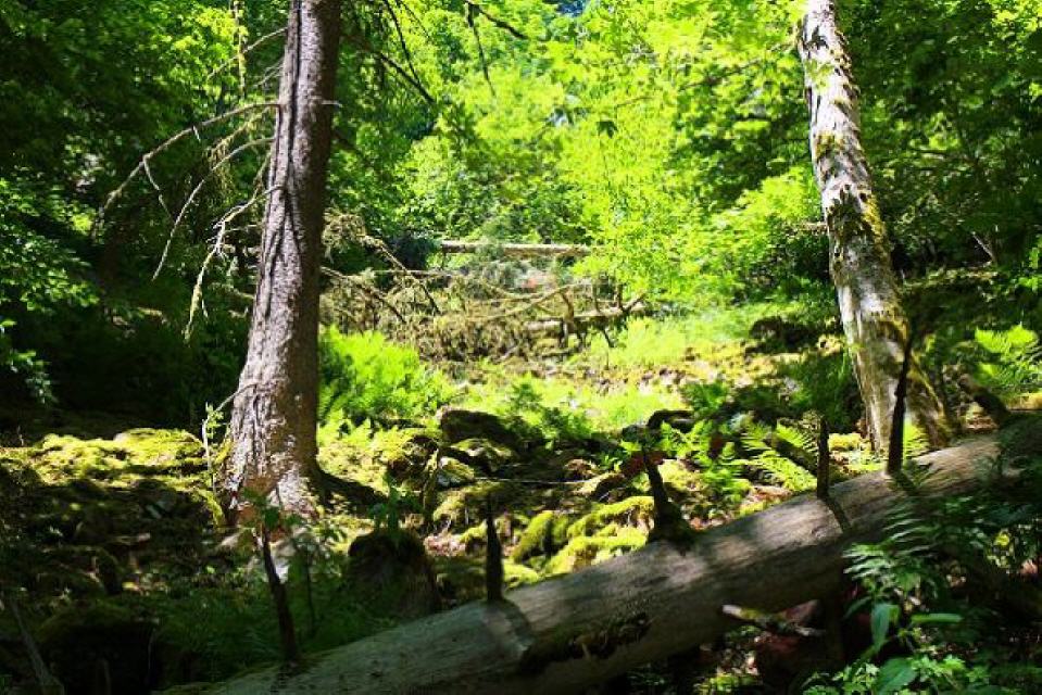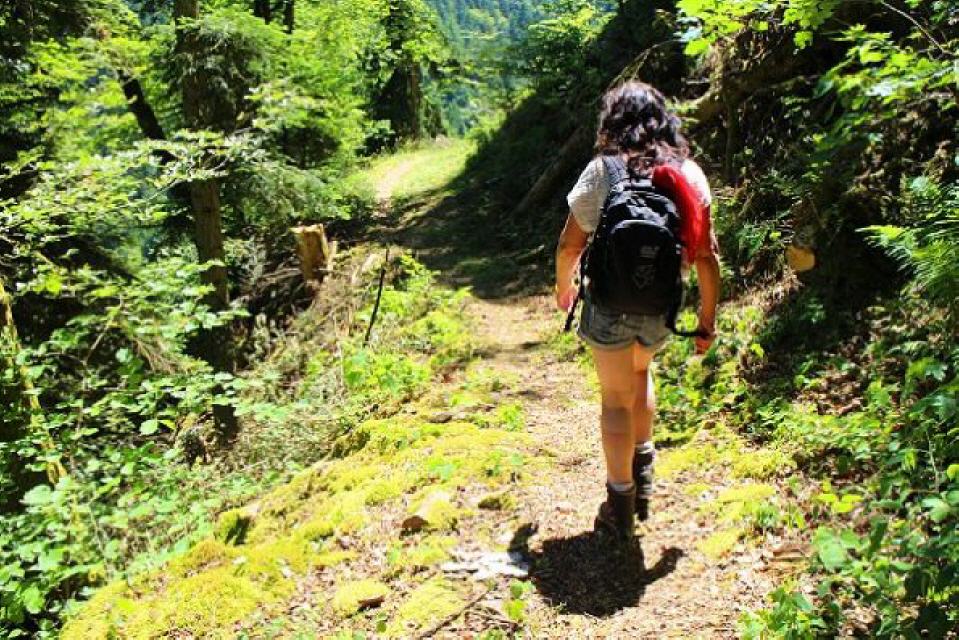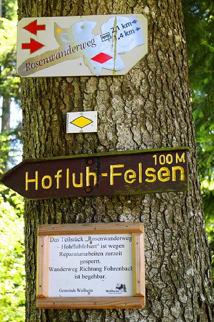 Wir gehen kurz auf der Hauptstraße abwärts und zweigen in der Serpentine geradeaus ins Haselbachtal ab, in dem wir bald darauf zusätzlich zur roten Rosenmarkierung die rote Raute des Schwarzwald-Mittelweges erkennen. Der Haselbach markiert hier die Grenze zwischen Weilheim und Indlekofen (Stadt Waldshut-Tiengen). Er bildet kurz oberhalt der Einmündung einen sehenswerten Wasserfall.