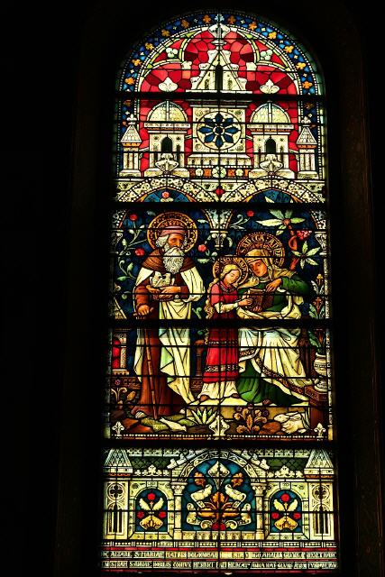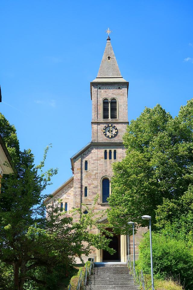 Der Chor hat sieben Zwillingsfenster, von denen die mittleren drei figürlich gestaltet sind. Hinter dem Hochaltar ist eine zweiteilige Emmausszene zu sehen. Das Zwillingsfenster links davon zeigt Bernhard von Baden und Kaiser Heinrich II., rechts König Ludwig IX. und Johannes den Täufer. Die übrigen vier äußeren Zwillingsfenster haben lediglich Ornamentränder. Dies deckt sich mit Simmlers Empfehlung aus dem Jahr 1892: „Glasmalereien würde ich nur im Chore und nur die vom Schiff aus sichtbaren Fenster anbringen lassen.“ Zudem empfahl er die Verwendung von Kathedralglas. Die Fenster wurden 1894 von Helmle & Merzweiler in Freiburg ausgeführt.