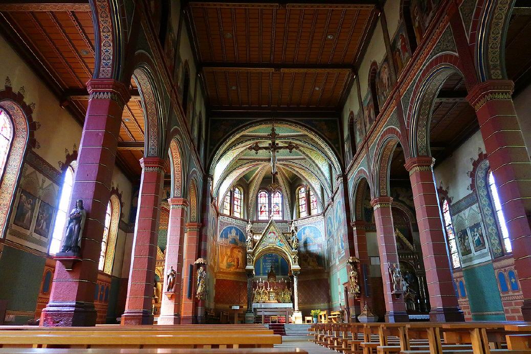 Das Innere wird bestimmt durch die Ausmalung Franz Simmlers, deren Details der tiefen satten Farbtöne wegen und mangels Licht – eine Folge des Fehlens von Obergadenfenstern – schwer zu erkennen sind. Wo die Bemalung mit Ölwachsfarben nicht figürlich ist, nehmen Ornamente, gotisierende Ranken, Palmetten, Mäander und Rundbogen große Flächen ein. Auch die Decke mit schweren Querbrettern und feineren Längsstäben ist in Hauptschiff und Seitenschiffen ornamental bemalt. Am Eingang des Chors befinden sich gefasste Holzfiguren: auf der linken Seite des Chorbogens Maria mit Kind, die 1935 von Bernhard Morath gestiftet wurde, auf der rechten Christkönig.