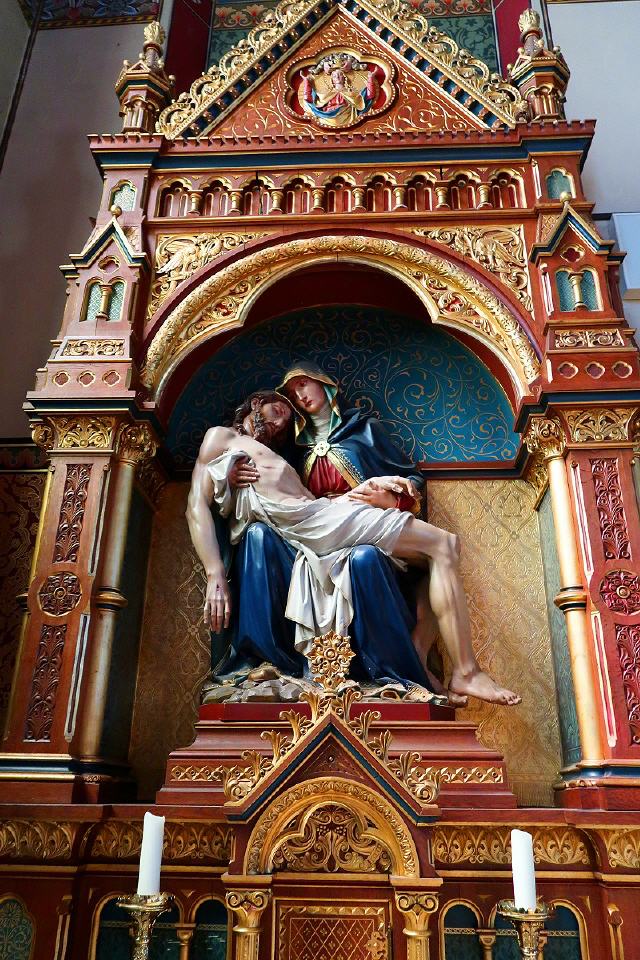 Im Antependium befinden sich drei Bronzetafeln mit Opferszenen aus dem Alten Testament: Abel opfert ein Lamm, Melchisedek bei der Begegnung mit Abraham Brot und Wein, und Abraham will seinen Sohn Isaak als Opfer darbringen. Der Tabernakel wird von Reliefs der vier Evangelisten flankiert. Die Säulen tragen als Ziborium einen Baldachin mit einem Wimperg. Auf dem Goldgrund der Stirnseite des Wimpergs ist eine Herz-Jesu-Darstellung vor einer Mandorla flankiert von zwei Engeln mit Weihrauchgefäßen zu sehen. An der linken Seite befindet sich eine Darstellung von Thomas von Aquin in Dominikanertracht und mit einem Buch, das auf seinen Hymnus Tantum ergo verweist. Auf der rechten ist die heilige Barbara mit Kelch, Hostie, Krone und Märtyrerpalme abgebildet. Zu beiden Seiten des Baldachins stehen unter eigenen Baldachinen die Kirchenpatrone Petrus und Paulus.