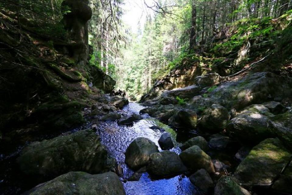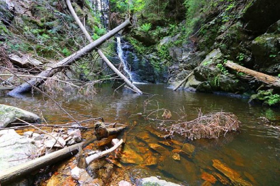 Am Wasserfall führt eine hölzerne Treppe hinunter. Aufgrund von Sturmschäden ist jedoch Vorsicht geboten. Die ehemalige Brücke ist selbst nach Jahren zerstört und nicht wieder ersetzt worden. Jedoch lässt sich der Gebirgsbach über die im Wasser liegenden Steine überqueren. Auf der anderen Seite führt ein hölzerner Weg weiter und wird von einem ansteigenden Waldweg abgelöst. Beim Aufstieg durch den Wald links halten und auf der ersten Straße fast ebenerdig zurück zur Kuranlage laufen.