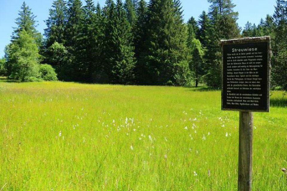 Der gut begehbare Bohlenweg führt durch Fichtenwald aus dem Moor heraus. Bald öffnet sich das Gelände in parkartige Streuwiesen. Sie liegen auf feuchtem Gelände, in dem Grundwasser zur Oberfläche aufquellt. Früher mähte man sie zur Gewinnung der Einstreu für den Stall, heute ist die Pflegemahd eine Naturschutzmaßnahme. Am Wegweiser „Mooshof“ wendet man sich nach Westen. Ab hier durchwandert man schöne Bergwiesen, die um das Moor herum liegen und im Frühling prächtig blühen. Bald nähert man sich wieder dem Fichten-Moorwald, 50 Meter nach dem Grillplatz geht es auf der im Winter als Loipe genutzten Trasse in den Wald. An Sportplatz und Gewerbegebiet vorbei erreicht man den Ausgangspunkt.