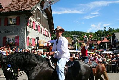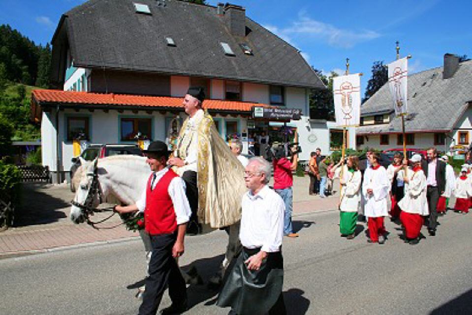 Hoch zu Ross erleben die Bauern in ihrer Schwarzwälder Tracht den Gottesdienst. Gesenkten Hauptes, als wären sie sich der feierlichen Handlung bewusst, stehen die mit Blumenkränzen und frischem Tannenreis geschmückten Pferde da. Mit goldfunkelndem Kreuze segnet der Priester im festlichen Ornat das vor ihm ausgebreitete Eulogiusbrot. Er segnet auch die niedergeknieten Gläubigen und sprengt das geweihte Wasser über die Pferde. Langsam schreitet der Zug an geschmückten Häusern vorbei zum Ort zurück, wo vor der Kirche in feierlichem Tedeum, umbraust vom Glockengeläut, die kirchliche Feier ausklingt.