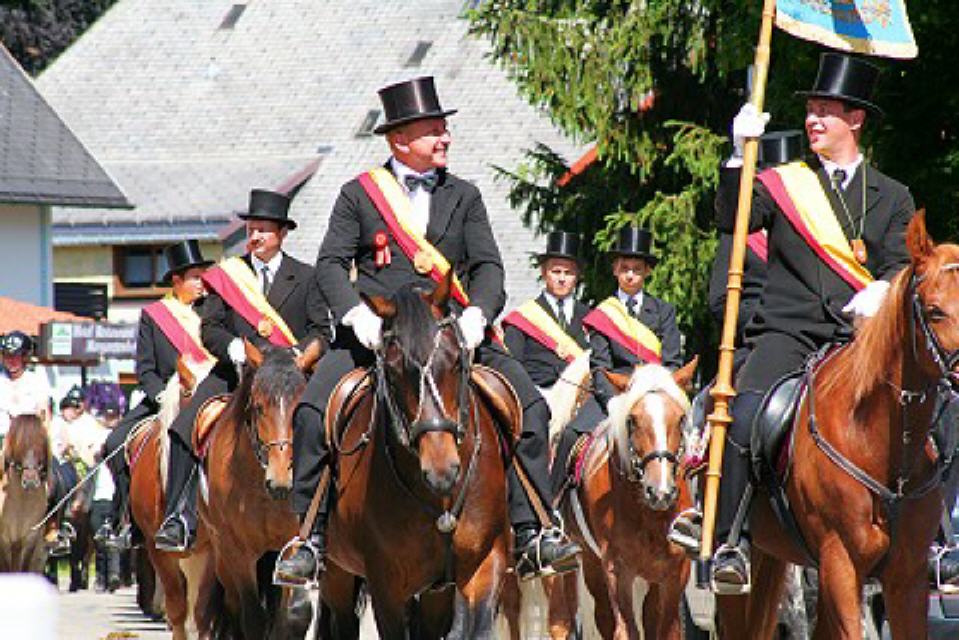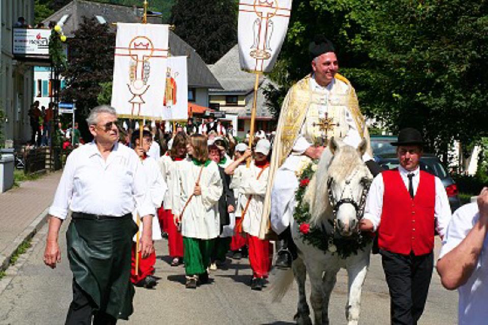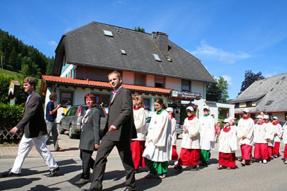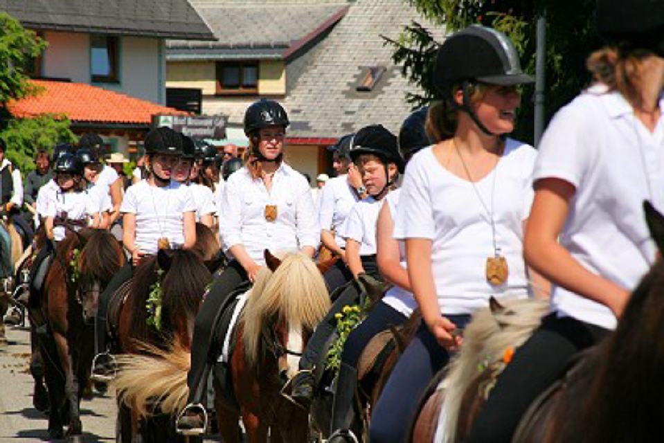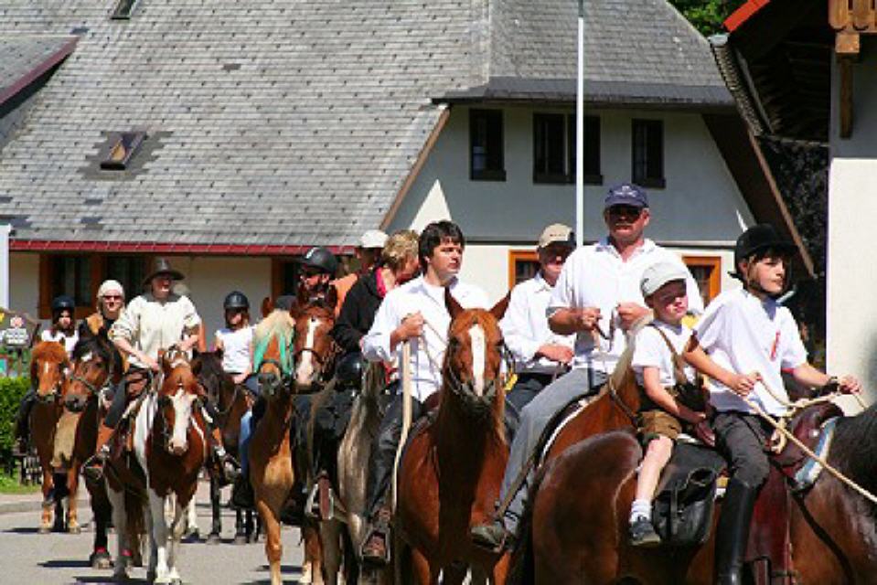 Von nah und fern kommen am Festtagsmorgen Rosse und Reiter, versammeln sich und ziehen – voraus die Chorknaben in roten Gewändern und mit wehenden Fahnen – zum Feldaltar, der bei dem im Friedhof stehenden Eligiuskirchlein auf einem Wiesenplan aufgeschlagen ist. Eine Musikkapelle in schmucken roten Bauernwesten begleitet den Gesang der Gläubigen. Wie blankes Gold funkeln die Instrumente in der Sonne. Fromme Lieder steigen aus hunderten von Kehlen zum Himmel empor. Es singen die Bäuerinnen, die, angetan mit der ernsten Bänderhaube, vom Gebiet um den Titisee herüberkamen, oder jene mit den gestickten blauen und grünen Miedern und dem schmucken Strohhut aus der Breitnauer Gegend.