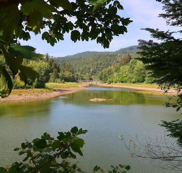 Dann bleibt man auf der rechten Seite des Ufers und beginntden See zu umrunden. Wenig später erreicht man eine Kneipp-Anlage am Albstausee, die versteckt im Wald einen Blick auf den See gewährt. Hier kann man die Füße im Wasser abkühlen und die Waldluft genießen. Erholt geht es weiter den Seerundweg entlang bis zur Staumauer.