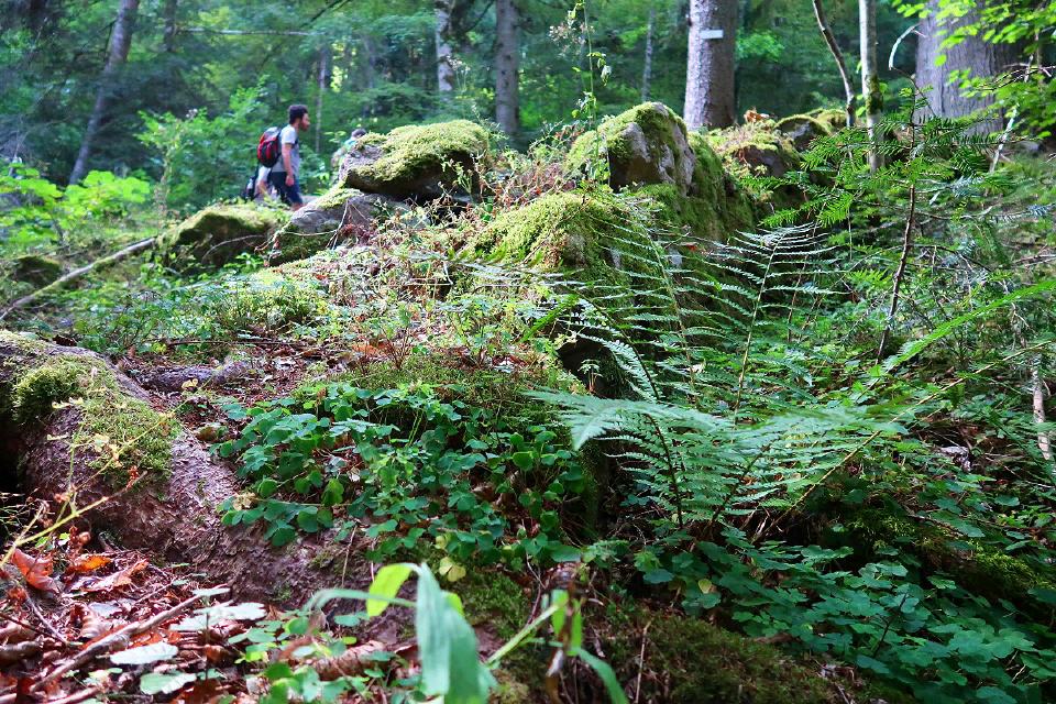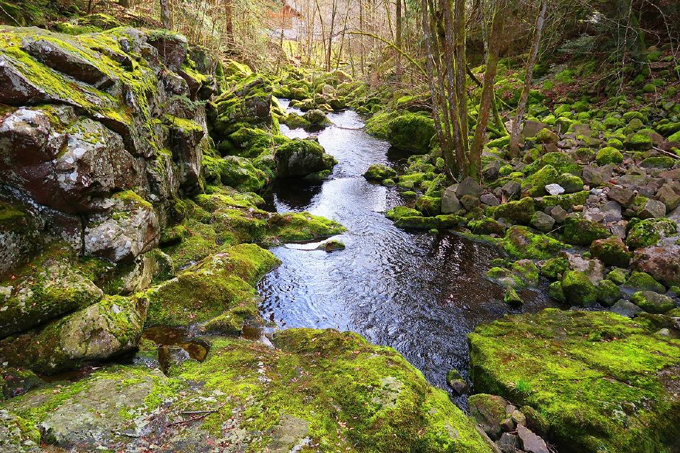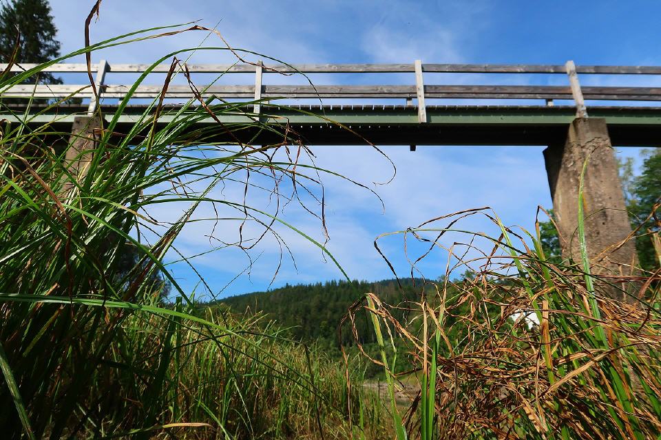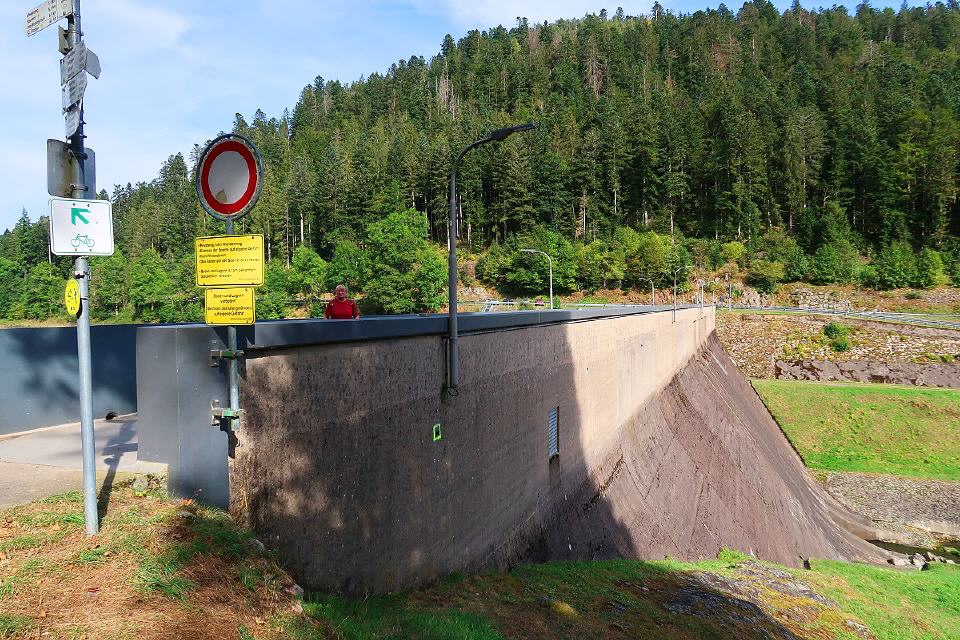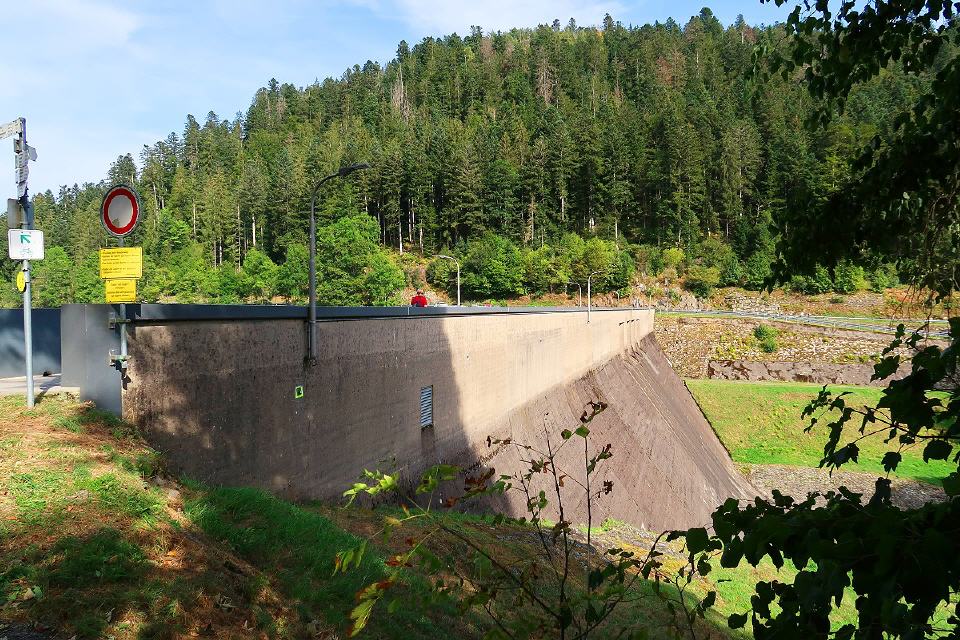 Nun wird die Staumauer überquert, anschließend rechts halten und 200 Meter auf der asphaltierten Straße abwärts laufen. Man läufst an Häusern vorbei, bis man an einen Trampelweg gelangt, der zur Bushaltestelle „Schmelze“ führt. Hier die Straße überqueren und links in den Wanderweg Richtung St. Blasien abbiegen. Nach einigen Metern linkerhand den kleinen Pfad bergab Richtung Straße und St. Blasien nehmen. Diesem folgen, bis die Straße erneut überquert wird und man über die Holzbrücke ans andere Ufer gelangt. Auf demselben Weg erfolgt die Rückkehr zum Haus des Gastes.