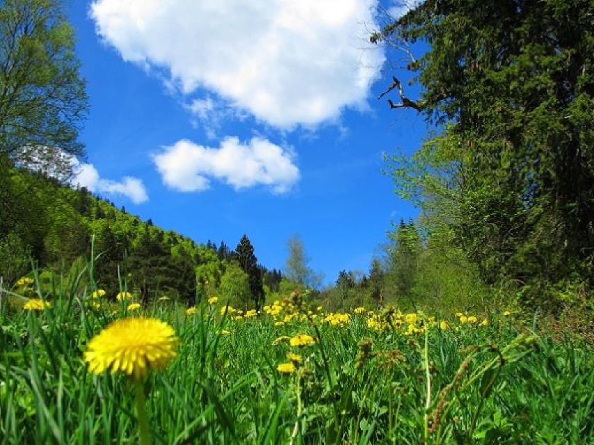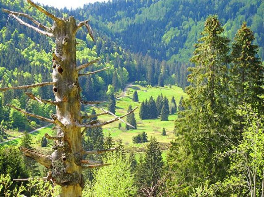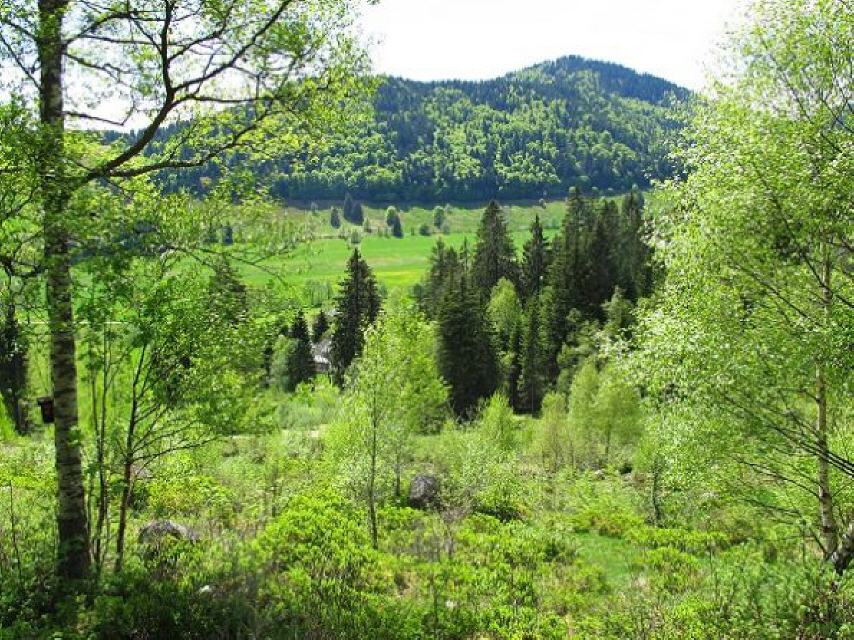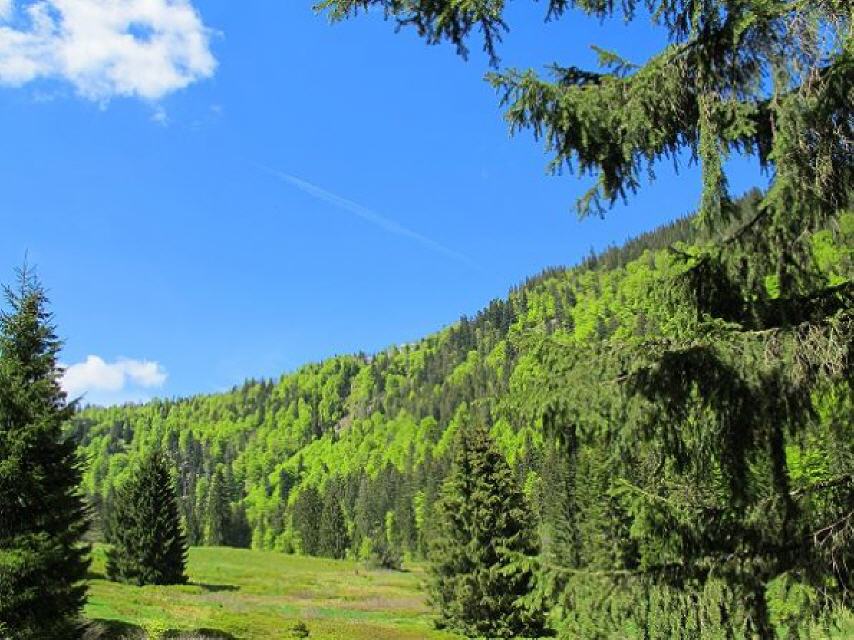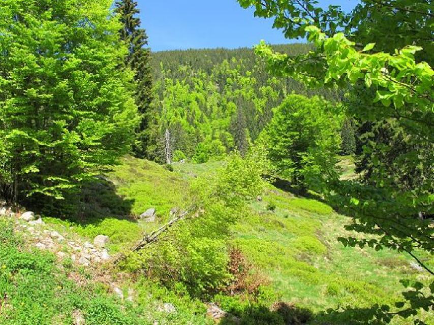 Nach wenigen Metern öffnet sich der Wald und gibt einen herrlichen Blick frei ins Klusenbachtal. Vorbei an einem alten Köhler-Platz geht es talabwärts.