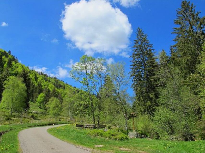 Nach etwa 500 Meter verlassen wir den Weid-Berg, folgen dem Teerweg (Brandweg) bis zum Sägehüttle. Dort geht es Richtung Norden übers Ellerwegle zum Ausgangspunkt, dem Mösle-Parkplatz. Von hier hat man nochmals einen sehr schönen Blick auf den Schwarzberg und kann den vielen kleinen weißen Punkten nochmals ein „Auf Wiedersehen in Menzenschwand“ zurufen.