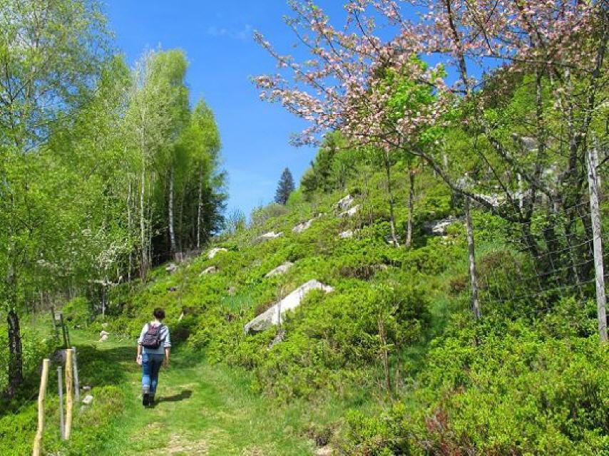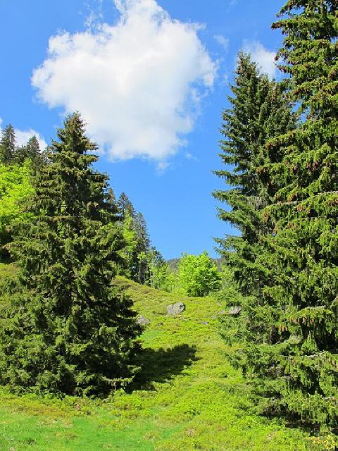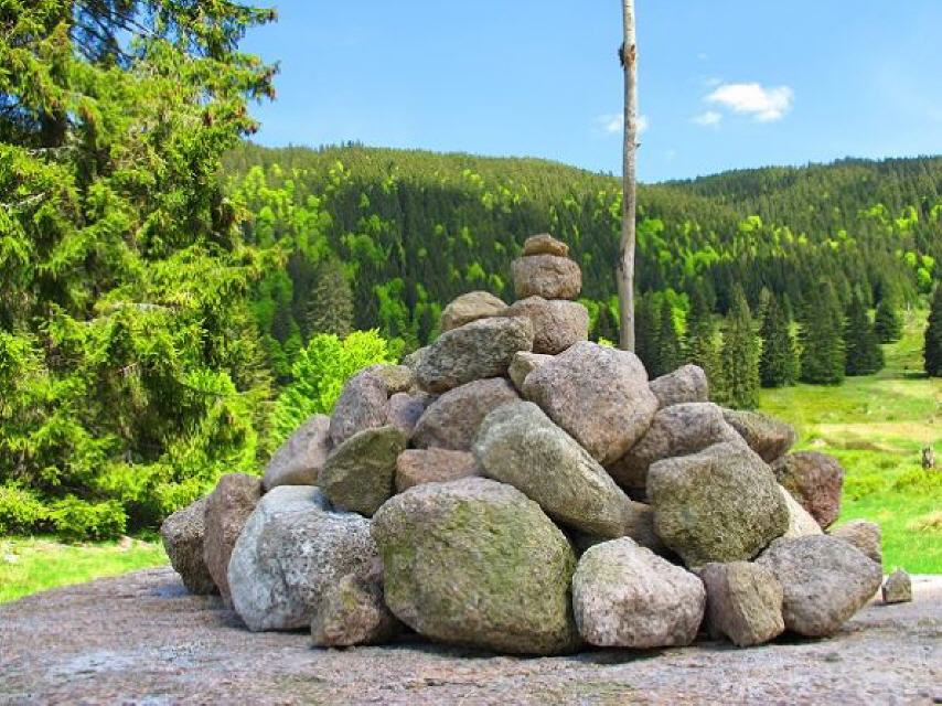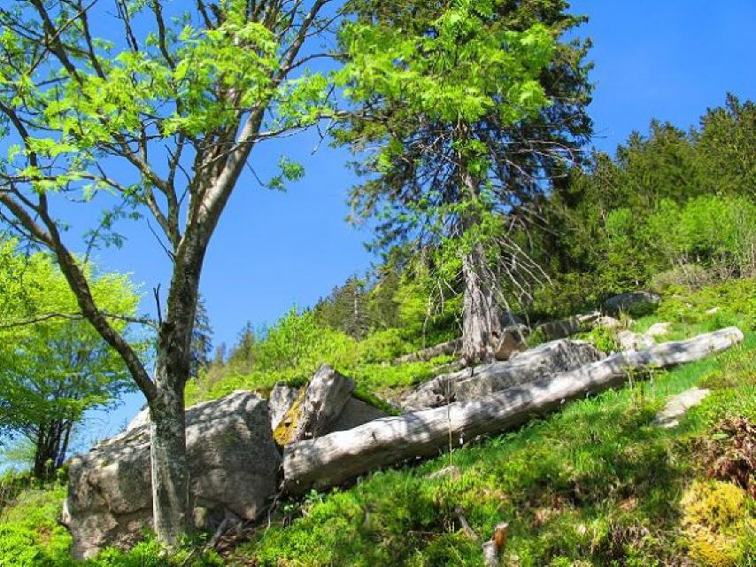 Halbrechts abbiegend folgen wir dem Schwarzbergweg (Richtung Zweiseenblick). Es geht bergan und wird steinig und ein wenig rauer. Ein Weg, wie ihn die Ziegen lieben und wer weiß, vielleicht sind ja auch Wald-Wuseli zu entdecken?! Wir folgen dem Pfad, die Landschaft öffnet sich und der Blick geht zu den End-Moränen des ehemaligen Feldberg-Gletschers der hier an die 400 m hoch alles überdeckte.
