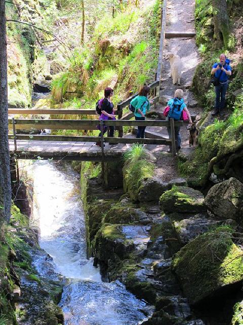 Bei diesem Einstieg laden eine Sitzgruppe und zwei Sitzbänke zum verweilen ein. Wir lassen den Wasserfall an uns vorbeirauschen, drehen uns immer wieder um und bleiben stehen.