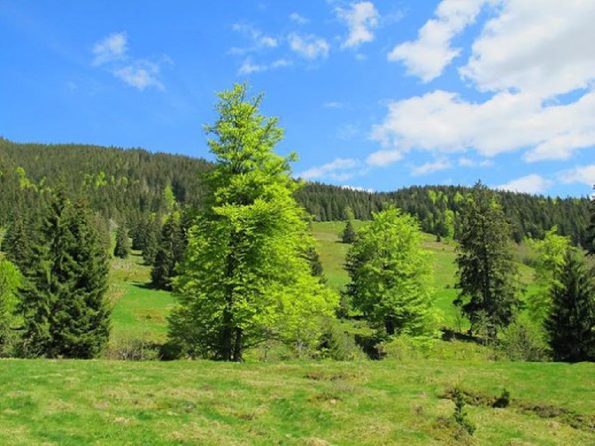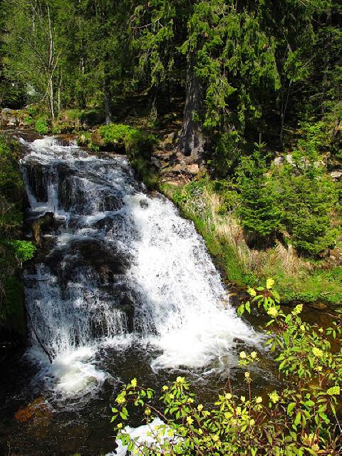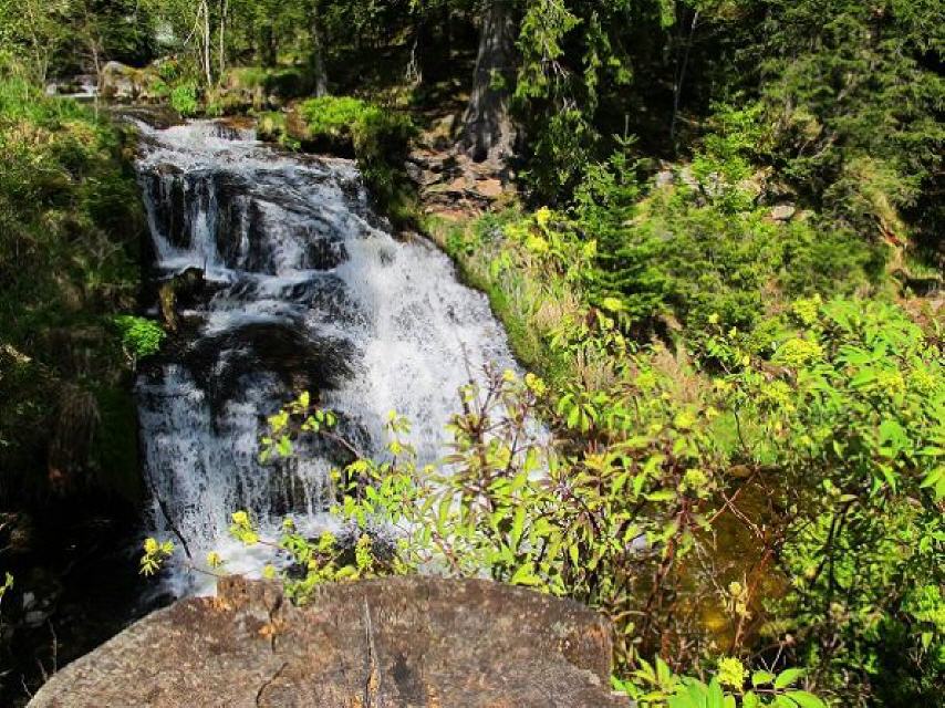 Nach dem Wasserfall haben wir die Möglichkeit zur Einkehr im Café & Berg Beizle „Zum Kuckuck“. Anschließend folgen wir dem Asphaltweg ein kurzes Stück bergan bis zur Übersichtstafel. Von dort geht es auf einem Menzo-Weg über den Weidberg, den Kohlbrunnen bis zu einem besonders schönen Erlen-Wäldchen und den beiden Radon- und Fluorit-Quellen. Über eine Krunkelbach-Brücke kommen wir zum Brandweg, überqueren diesen und folgen dem Pfad oberhalb der Lesestein-Mauer über die Krunkelbach-Weiden Richtung Osten.