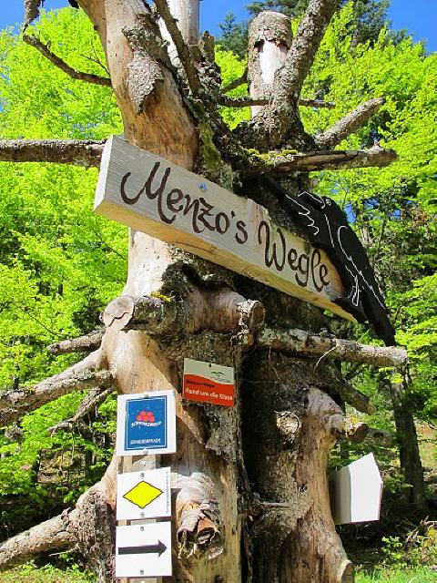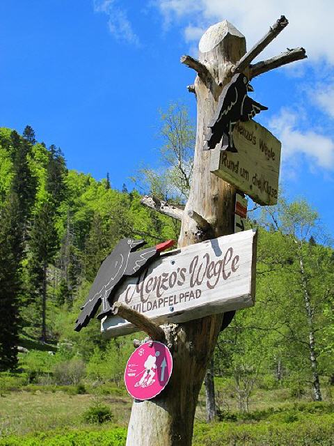 Bald erreichen wir den Albweg am Fuß der Moränen, folgen dem Schotterweg nach rechts und bleiben auf dem Albweg. Der Rabe weißt uns den Weg „Rund um die Kluse“, vorbei am „Moränen-Monschderle“, an „Flößer‘s Rast“ und dem „Titlis Blick“ bis zum Talschluss. Dem Weg folgend queren wir über einen Holzsteg die Menzenschwander Alb.