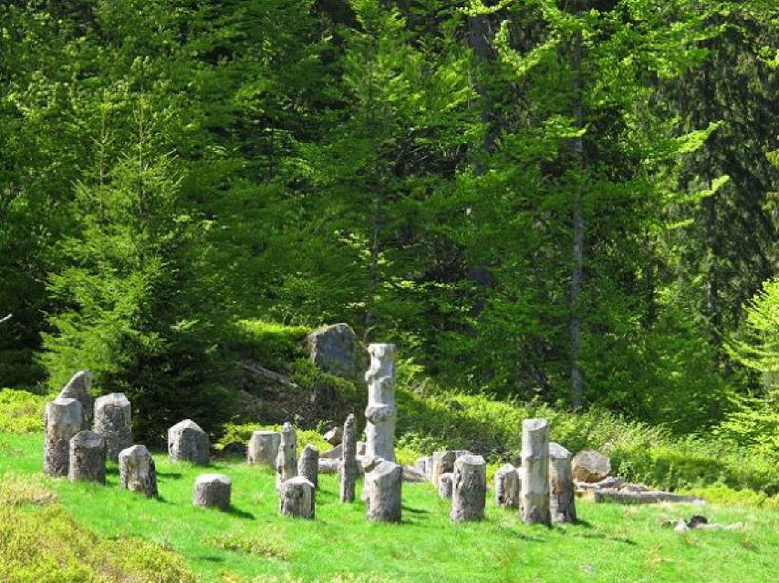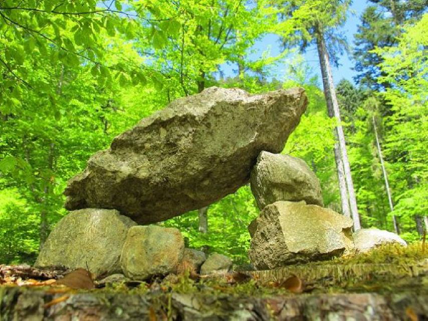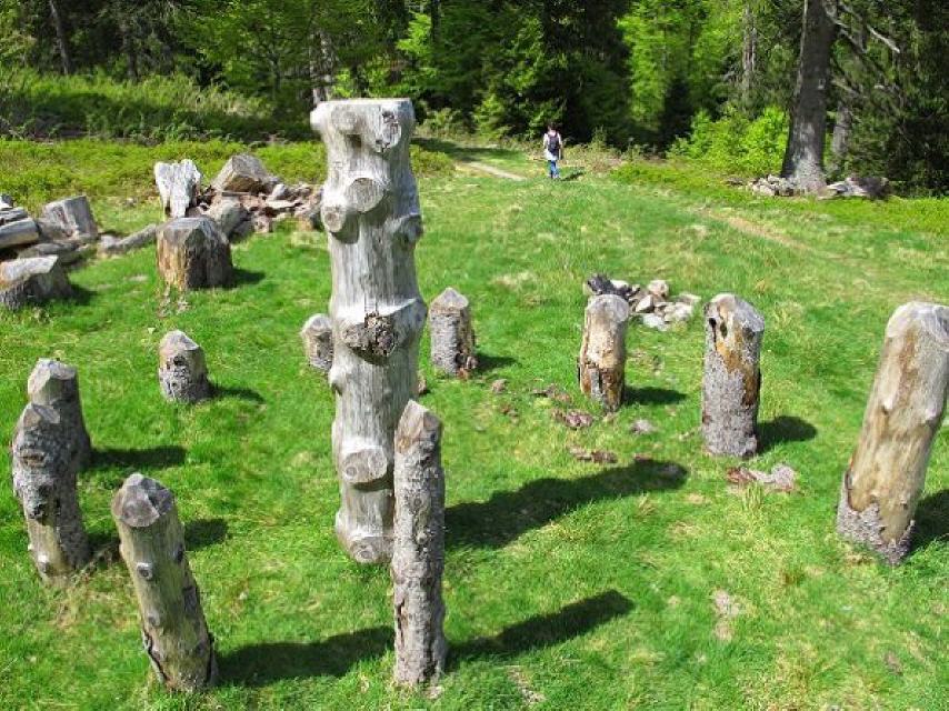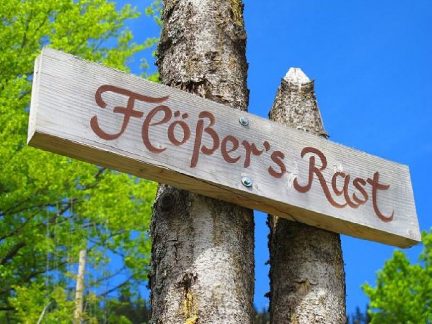 Ein Rastplatz lädt ein, sich die Kluse näher anzuschauen. Nach einer kurzen Pause passieren wir die drei End-Moränen. Wir halten uns westlich der Alb und erreichen die Abzweigung „Schesslong dü Boah“. Über einen schmalen Wiesenpfad kommen wir zu einem Waldsofa und der Knüppelcouch „Schesslong dü Boah“.