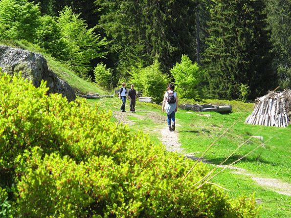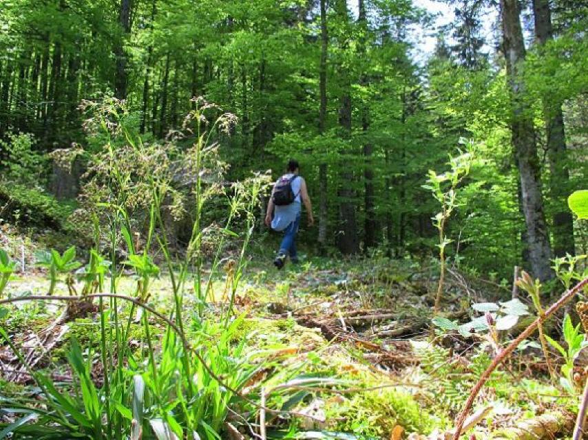 Kurz vor einer Ruhebank wählen wir den etwas breiteren Pfad und gehen bergab über den Gschweihweg.