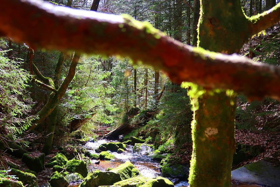 Sobald die letzten Häuser und ein Felsen auf der linken Seite passiert sind, ist bei der Holzbrücke der Einstieg in die kleine Schlucht geschafft. Und schon geht's mit dem Getöse des Wasserfalls los. Vor uns liegt eine kleine, malerische Schlucht. Der naturbelassene Weg wirkt recht abenteuerlich. Denn nur die ersten paar Meter sind einem Weg ähnlich. Schon nach der Überquerung der ersten Brücke führt der Pfad unmittelbar neben dem rauschenden Windbergbächle her. Es geht über Findlinge, über kleine und große Steine und dicke Wurzeln. Vorsicht ist dennoch geboten, denn es kann rutschig sein. Ringsherum türmt sich die Schlucht auf, Vogelgezwitscher ist zu hören, hin und wieder erhellen Sonnenstrahlen den Weg in die Enge. In der Sommerhitze herrschen hier angenehme Temperaturen. Dafür sorgen die Wasserfälle und der Schatten unter den Bäumen.