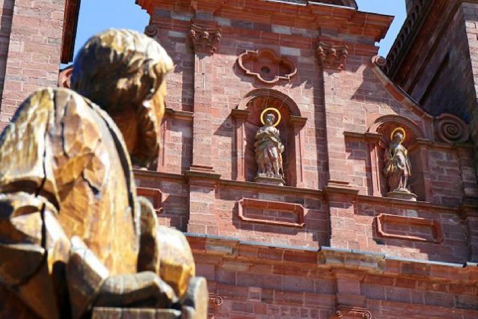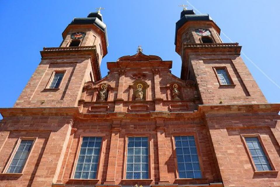 Kommt man von Freiburg durch das Eschbachtal herauf, sieht man schon von weitem die prächtige Rotsandsteinfassade der Kirche in Sankt Peter mit ihren doppelten Zwiebeltürmen und der klassischen horizontalen und vertikalen Dreigliederung, in die die Figuren des Heiligen Petrus, Benedikt und Ursula eingestellt sind.