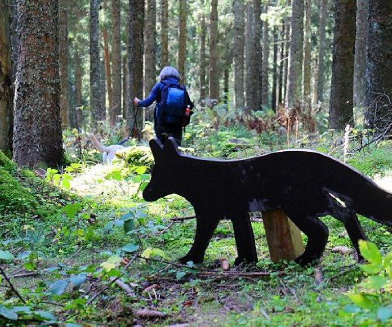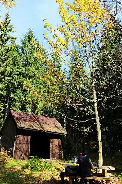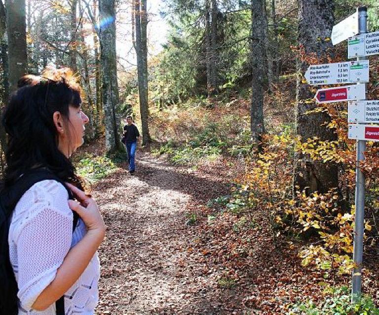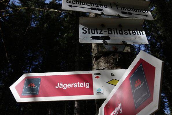 Vom Parkplatz „Im Wolfsgrund“ laufen wir durch die Unterführung der B500, folgen dem Wanderweg nach links und überqueren die L156 nach Lenzkirch. Nach der Kreuzung folgen wir dem Wander- und Radweg entlang der Freiburger Straße (B500). Nach kurzer Zeit sehen wir schon das Eingangsportal des Schluchseer Jägersteigs. Hier tauchen wir in den Bannwald ein und folgen dem schmalen Pfad, an einem Holzplatz vorbei hinauf zur Stutzhütte.