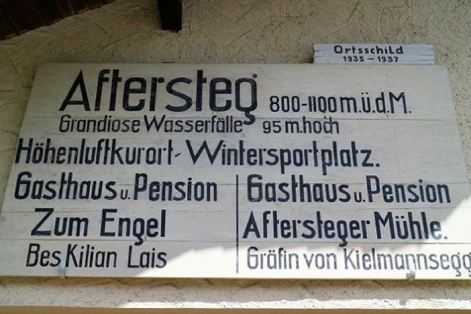Das althochdeutsche aftero bezeichnet ebenfalls nichts anderes als hinter oder nachfolgend. Im Niederdeutschen wurde übrigens dann achtern daraus. Der Ortsname Aftersteg, den es übrigens in Deutschland nur einmal gibt, wird erstmals erwähnt in den Büchern des Klosters St. Blasien um das 14. Jahrhundert, wo dazu vermerkt ist, dass es sich um eine Siedlung nach dem Steg handelt. Es gab damals über den Stübenbach unterhalb des Wasserfalls nur einen Steg und die von den angesiedelten Bergleuten bewohnten ursprünglichen sieben Höfe bildeten die Siedlung Nach dem Steg, also After-Steg. So jedenfalls die offizielle Erklärung der Gemeinde Todtnau.