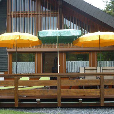 Auf der mit einem Geländer umschlossenen neuen Terasse finden Sie 3 Sonnenschirme, eine Sitzgruppe, Liegestühle und ein verriegelbares Gatter.