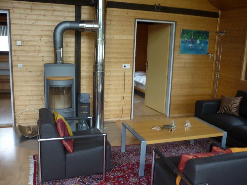 Großer, lichtdurchflossener Wohnbereich mit geräumiger und gemütlicher neuer Leder-Sitzgruppe. Zur Erhöhung der Behaglichkeit an kalten Tagen steht nun auch ein moderner Kaminofen zu Ihrer Verfügung.