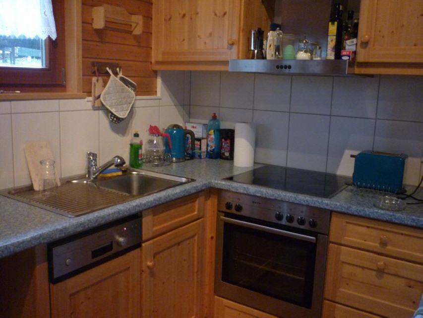 Moderne Vollholzeinbauküche mit 4-fach-Cerankochfeld, Backofen, Dunstabzug nach außen und Geschirrspülautomat mit angrenzender Essecke. Ein großer Kühlschrank mit großem Gefrierfach, Kaffeemaschine, Chibo-Kaffeeautomat, Raclette, Mikrowelle, Elektrogrill und Wasserkocher runden die Kücheneinrichtung ab.