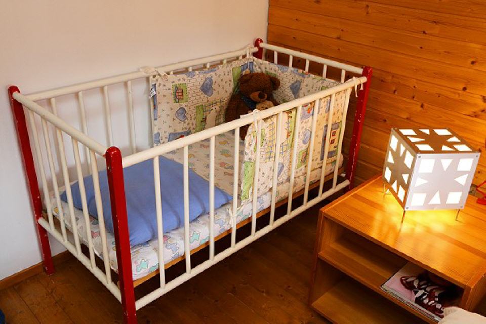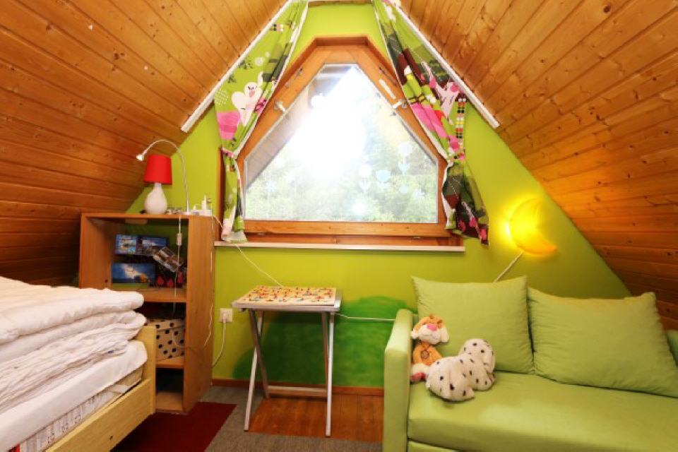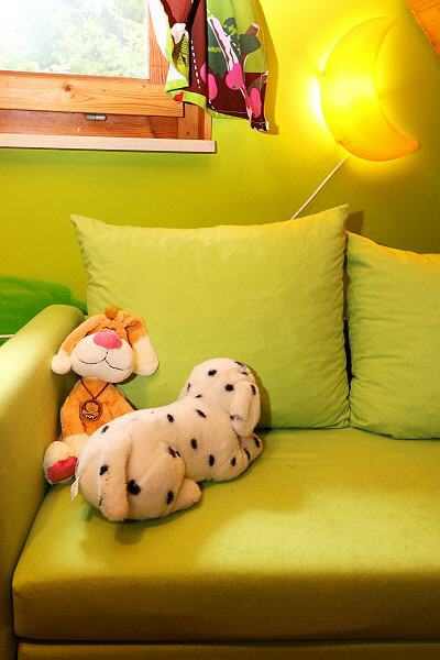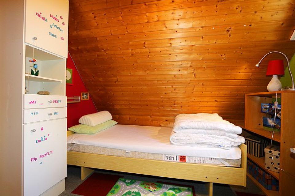 2. Schlafzimmer (Kinderzimmer): 1. Stock, ausgestattet mit Einzelbett (90×200), Fußbodenheizung, Kinderspielzeug, Malbuch / Stifte, Schlafsofa (110×180), Steckdosensicherung