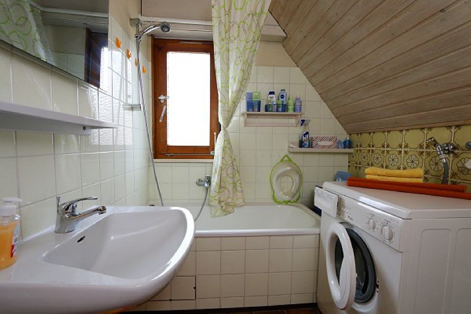 Badezimmer: Erdgeschoss, ausgestattet mit Badewanne, Dusche, Fenster, Fußbodenheizung, Föhn, Kinderhochstuhl, Kindertoilettensitz, Spiegel, Waschbecken, Waschmaschine, WC, Wickelauflage