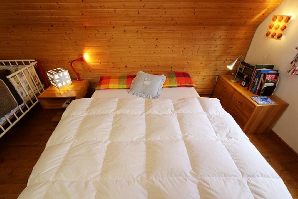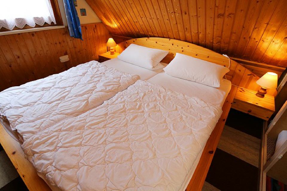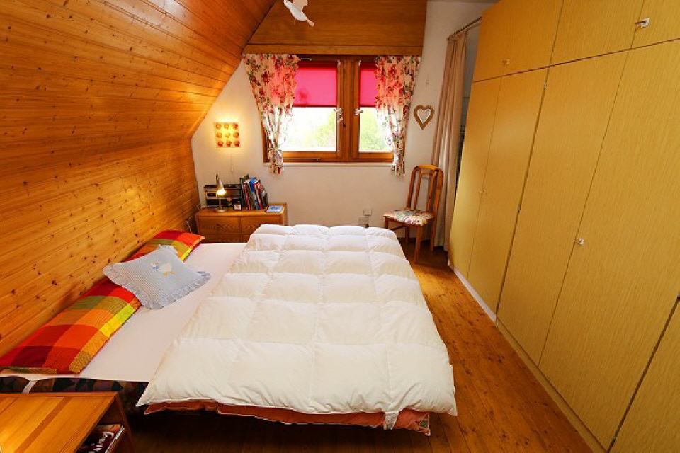Schlafzimmer: 1. Stock, ausgestattet mit Doppelbett (180×200), Fußbodenheizung, Kleiderschrank