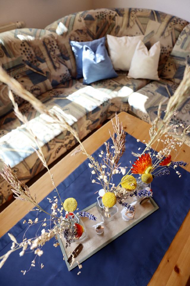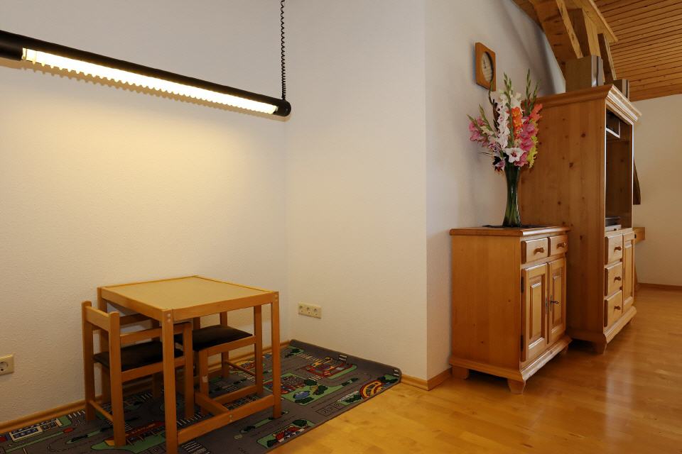 - Wohnzimmer: geräumiges, großes Wohnzimmer, gemütliche Sitzecke / Couch, Sessel, Tisch, Kommoden, Sat-TV, Spielecke mit Tisch und Hocker