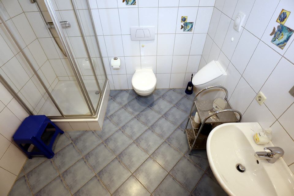 - Bad 1: ca. 8 qm Fläche, Dusche, Badewanne, Waschbecken, Spiegel, Pissoir, WC