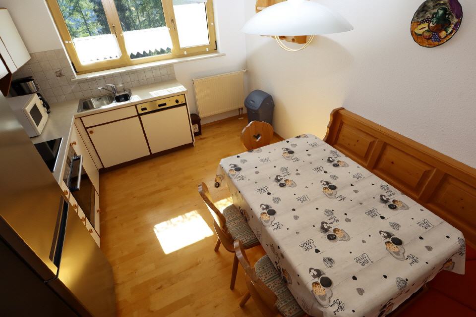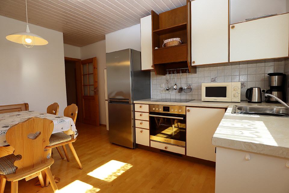 - Küche: Einbauküche, komplett eingerichtet mit Geschirr, Töpfe, Besteck, Handtücher, Ceran-Kochfeld, Mikrowelle, Geschirrspüler, Wasserkocher, Kaffeemaschine, Tisch, Eckbank, Stühle