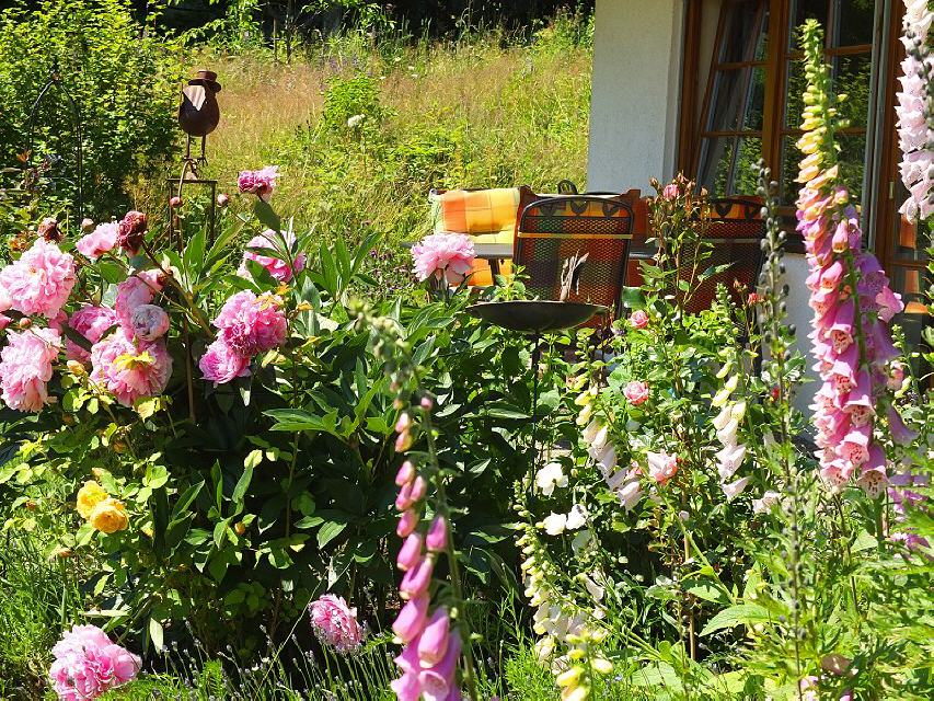 Unsere Ferienwohnung liegt inmitten einer grünen Oase. Ihre Terrasse ist umgeben von einem Duft- und Kräutergarten mit Rosen, Lavendel, Salbei, Thymian, Ysop und verschiedenen Sorten von Minze. Daran anschließend steht Ihnen die Liegewiese zur Verfügung mit Blick zur Haslach, auf die Weide und die Wildkräuterwiese, die nur einmal im Jahr gemäht wird und deshalb einen großen Bestand an Wildkräutern, Wildgemüsearten und anderen Pflanzen bietet.