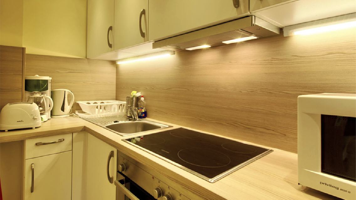 - Küchenzeile mit Elektroherd, Backofen, Kaffeemaschine, Mikrowelle, Wasserkocher, Toaster, Kühlschrank mit Gefrierfach