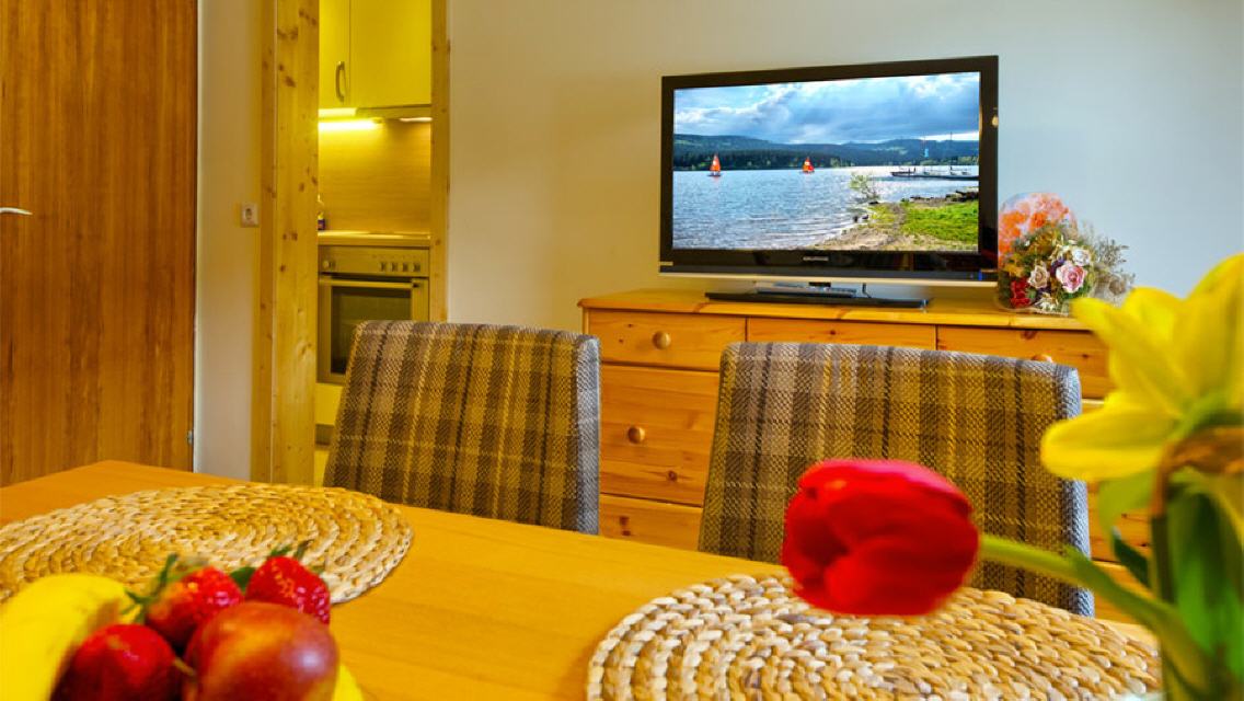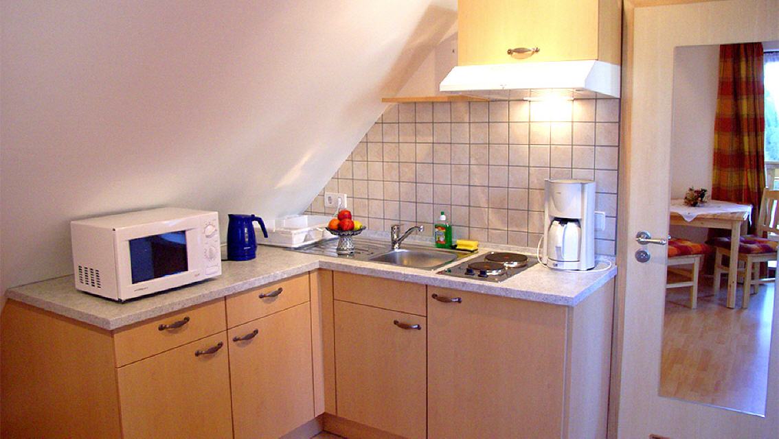 Freuen Sie sich auf moderne, großzügig im Landhausstil eingerichtete Ferienwochnungen (23,5 - 57 qm) mit Sat-TV, W-Lan, Dusche oder Bad, WC, Balkon oder Terrasse, gut ausgestattete Küchenzeile, Sitzecke. Gerne bieten wir Ihnen ein Frühstücksbuffet und Halbpension mit Menüwahl und Salatbuffet an. Im 2006 erbauten Haus liegen ausschließlich Nichtraucher-Ferienwohnungen.