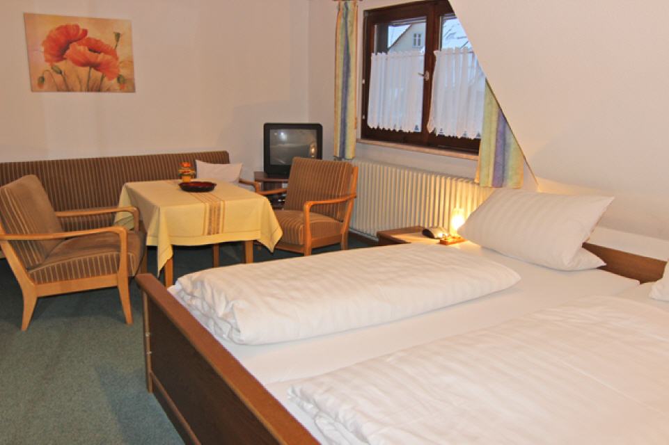 EZ mit Dusche, WC, fließend kalt / warm Wasser, SAT-TV / Kabel im Zimmer, Sitzgelegenheit, überlanges Bett (mind. 2 Meter), Weckeinrichtung, Fön, Zimmerservice