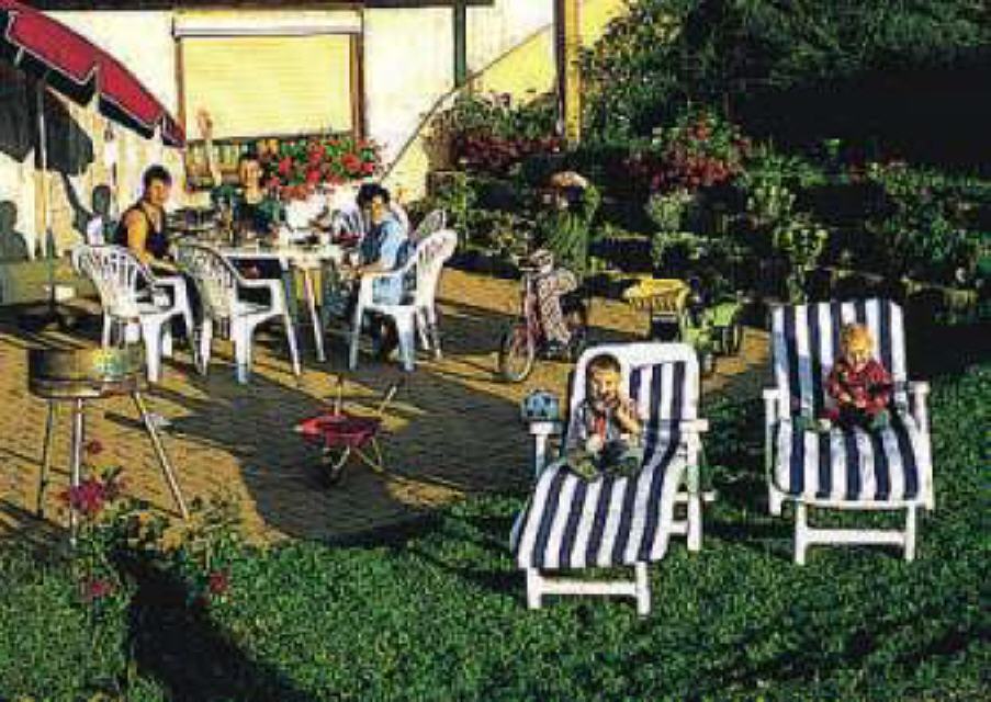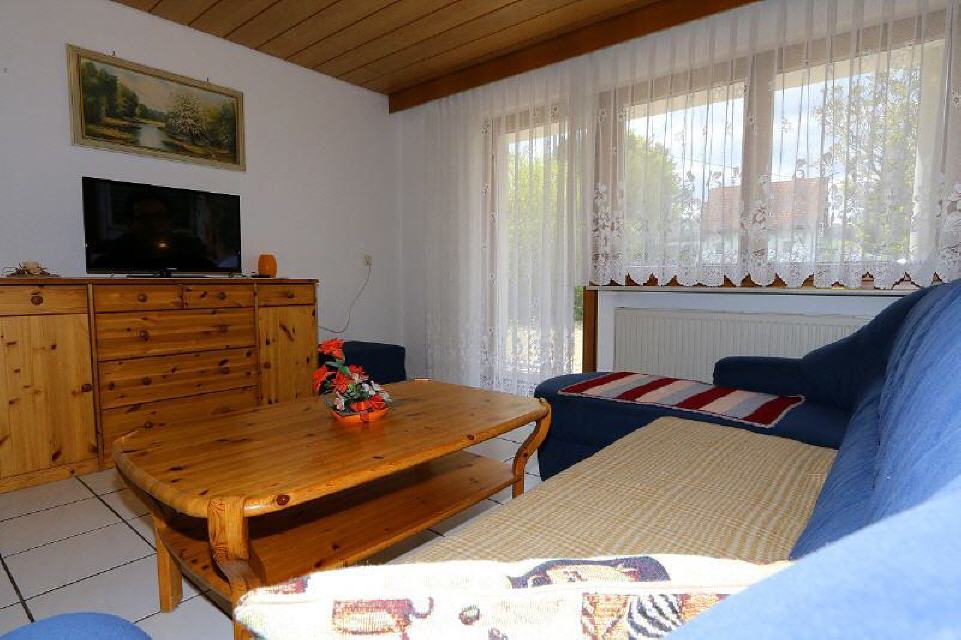 Auch diese Ferienwohnung liegt ebenerdig und hat einen separaten Eingang. Die Fewo hat eine Wohnfläche von 67 qm und bietet Platz für bis zu 5 Personen. Die Fenster haben Rolläden. Die moderne Einbauküche verfügt über Essecke, Mikrowelle Toaster Elektro- und Holzgrill. Das Bad mit Dusche hat Badewanne mit Haltegriffe, WC und Waschmaschine. Genießen Sie Ihren Urlaub auch auf der großen Terrasse, freuen Sie sich auf die Spiel- und Liegewiese mit Liegestühle und Gartenmöbel. Das Wohnzimmer hat Ess- und Couchecke, die eine weitere Schlafmöglichkeit bietet. Ihnen steht ein Sat-TV zur Verfügung. Die Wohnung hat 2 Schlafzimmer: