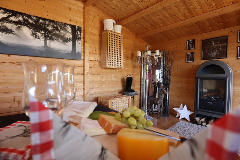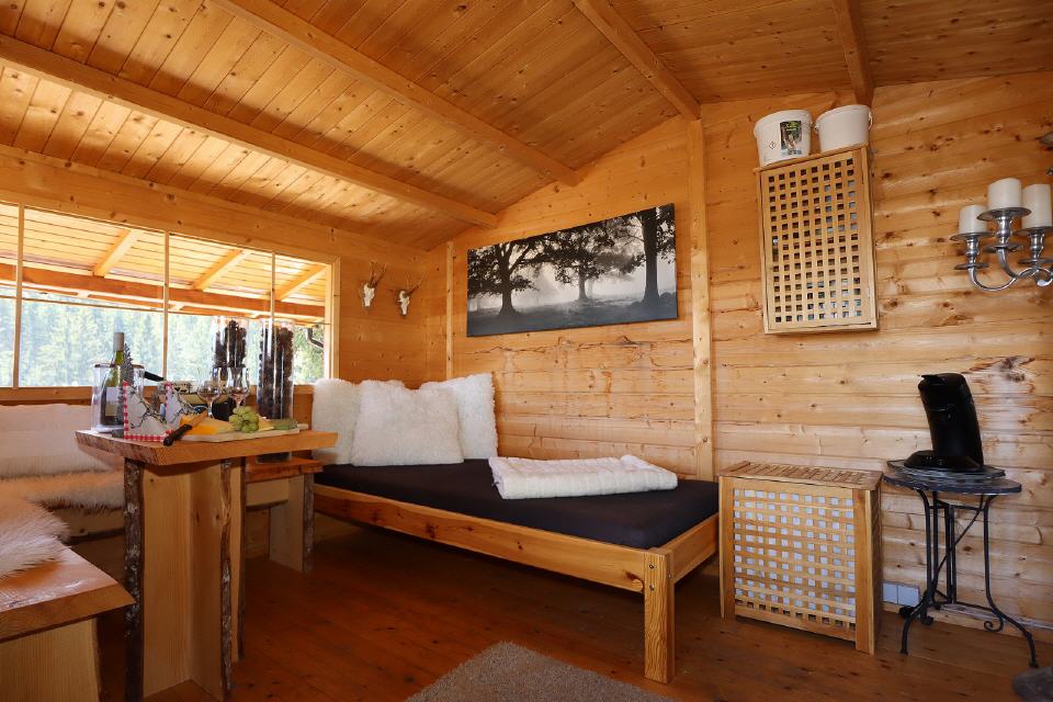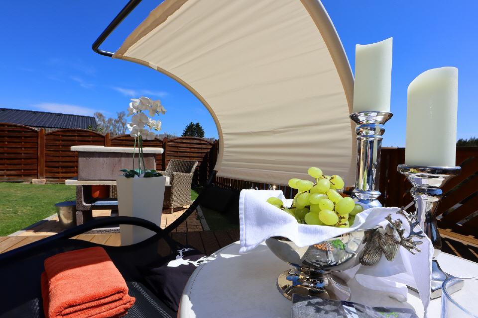 im Garten Wellnesshütte mit Musik und schöner Beleuchtung