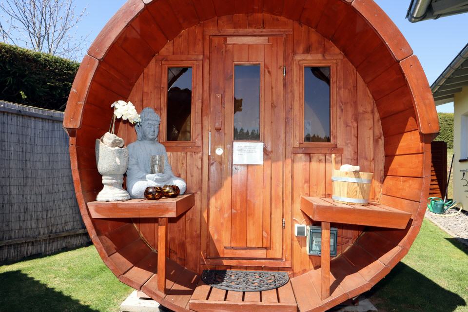 im Garten Wirlpool (ganzjährig 36 Grad) mit Saunafass