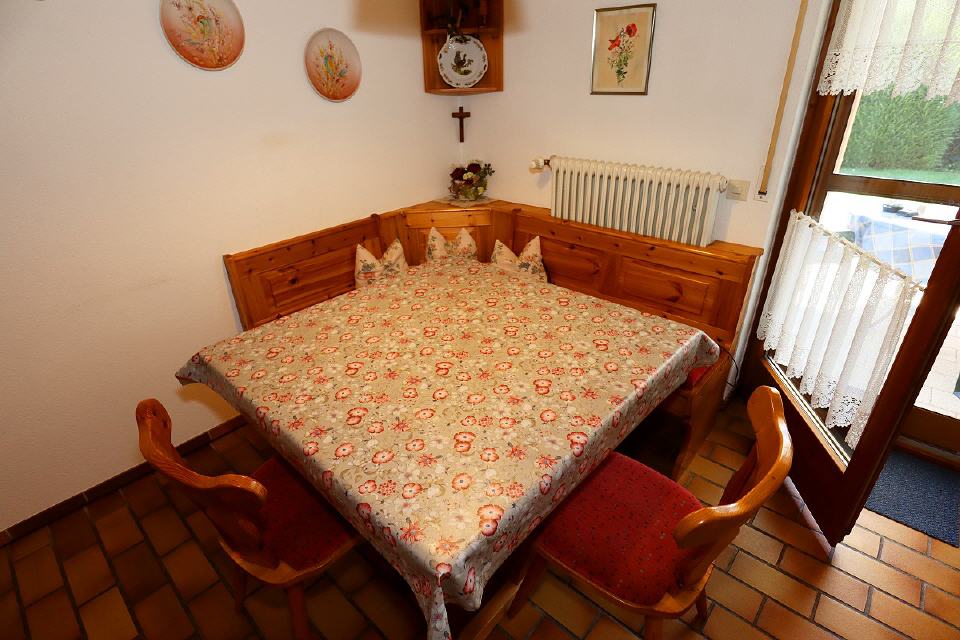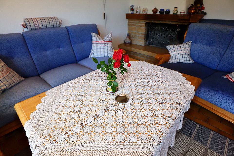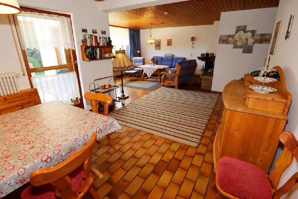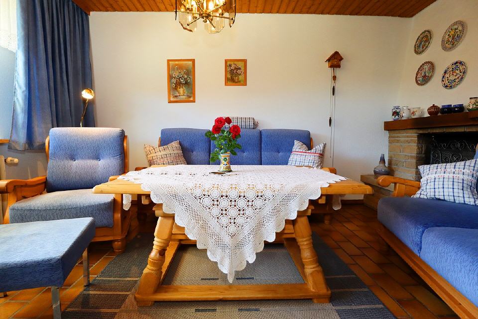 - Wohn- / Esszimmer: gemütliche Couchgarnitur, Tisch, Sessel, Sat-TV (Flachbildschirm), CD und DVD-Player, Radio, Schrank (Kommode), Sitzecke mit Eckbank und Stühlen, Ausgang zur Terrasse und zum Garten