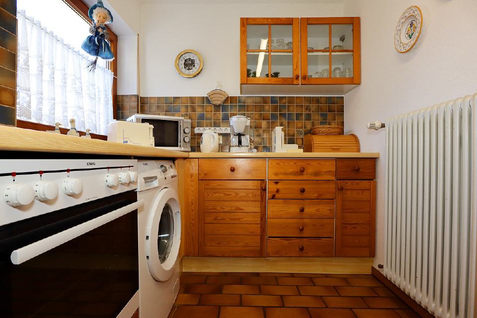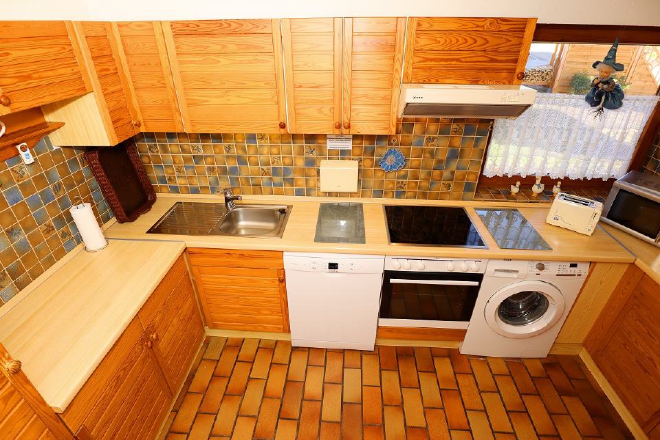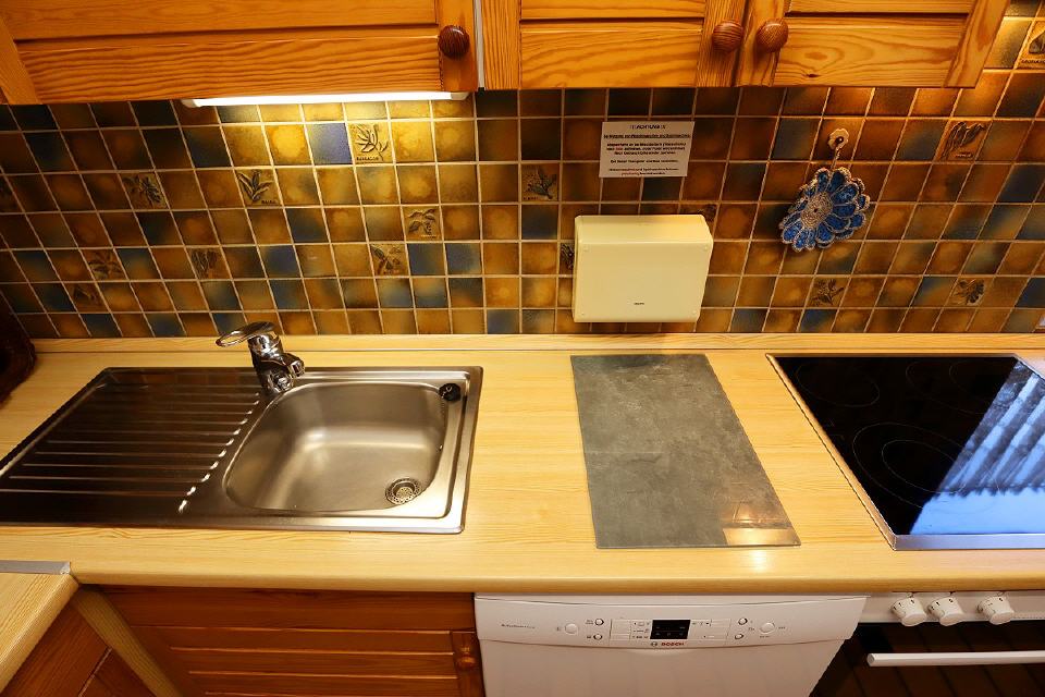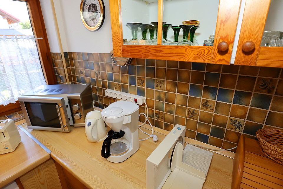 - Küche: komplett eingerichtet mit Herd (Cerankochfeld), Backofen, Geschirrspüler, Mikrowelle, Wasserkocher, Kaffeemaschine, Brotschneidemaschine, Toaster, Ess- und Kochgeschirr, Besteck
