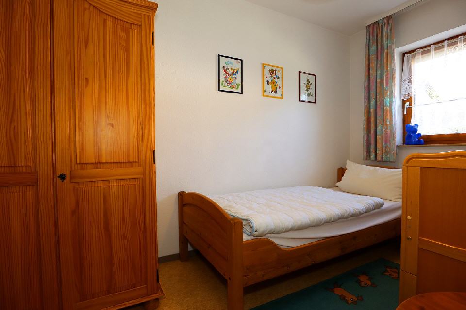 - 1 Zimmer mit 1 Bett und Kinderbett, Tisch, Nachttisch mit Leuchte, Schrank