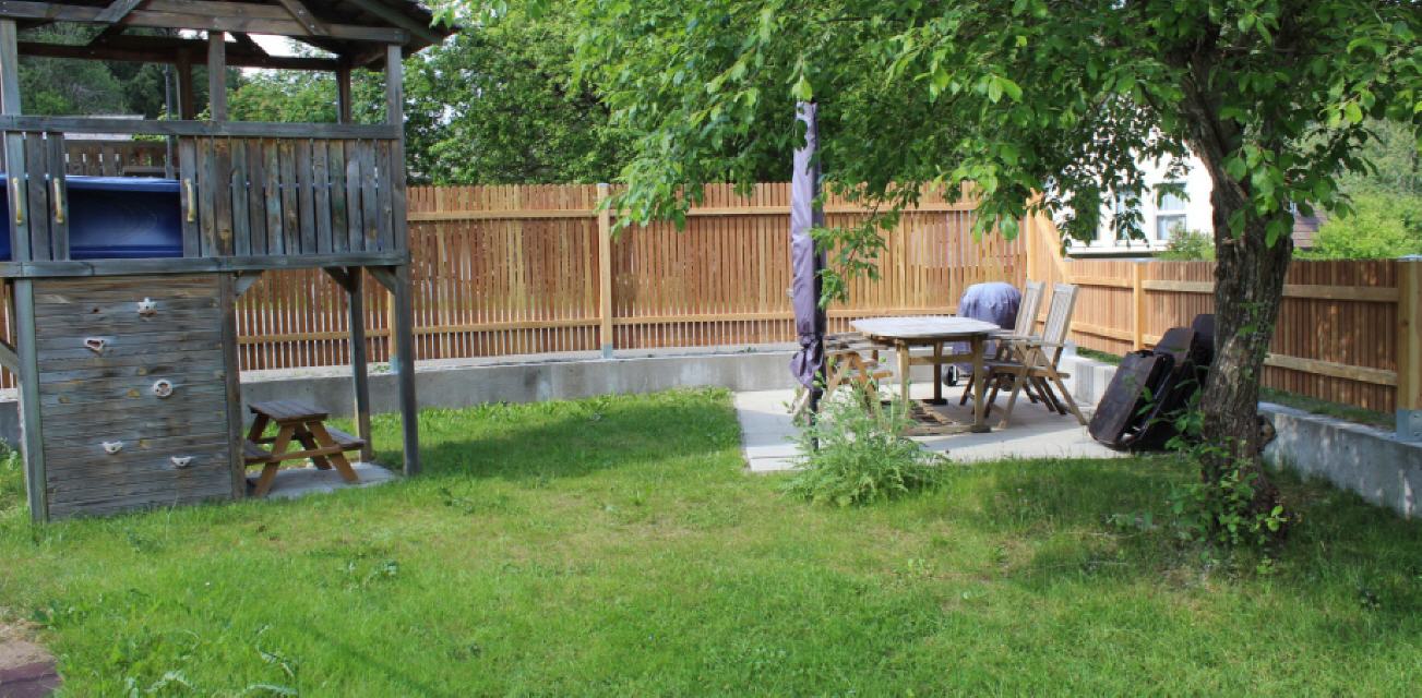 - Terrasse/Balkon mit Gartenmöbeln, Kletterturm, Rutschbahn, Kugelgrill,