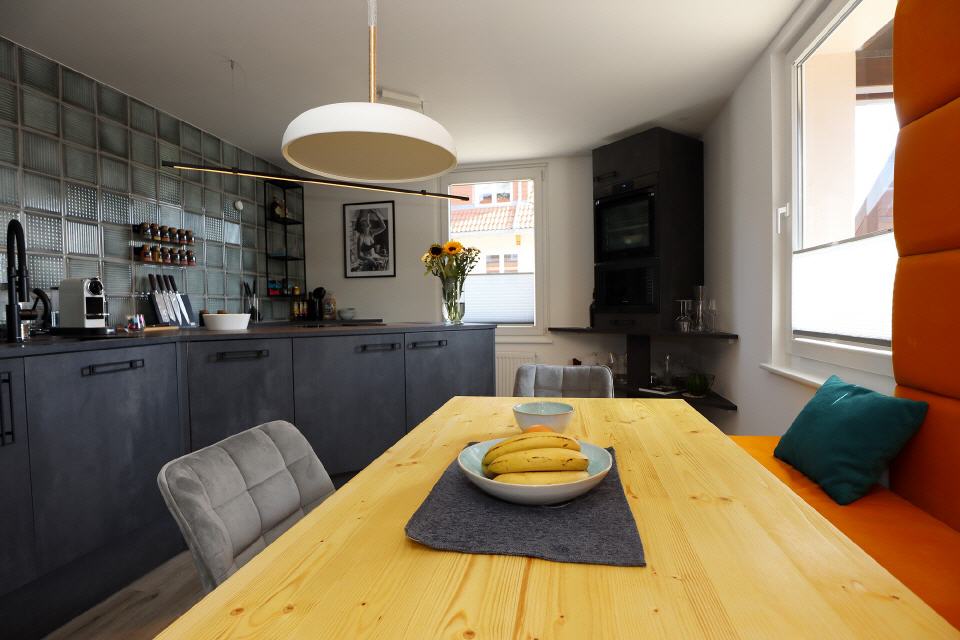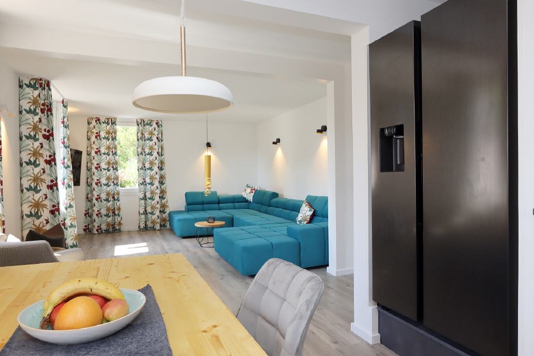 Wir haben bei der Sanierung und Einrichtung der Ferienwohnung BohoAmSee bewusst auf einen pseudo-Schwarzwaldstuben-Chic verzichtet und Lebensräume geschafen, die durch Individualität, lebensfrohe Farben und Kunst ein unvergleichliches Ambiente bieten. So wird in der vollausgestatteten Designerküche ein gemeinsamer und bgeselliger Koch-Event zu einem unvergesslichen kulinarischen Ereignis und die gemütliche Wohnlandschaft mit über 4 Meter Länge inspiriert zu interessanten Gesprächen oder animiert, mal ganz entspannt ein Buch zu lesen, einen spannenden Movie mit dem 55" LED Smart-TV anzuschauen oder seine Lieblingsmusik auf dem BoseSoundsystem anzuhörenb.