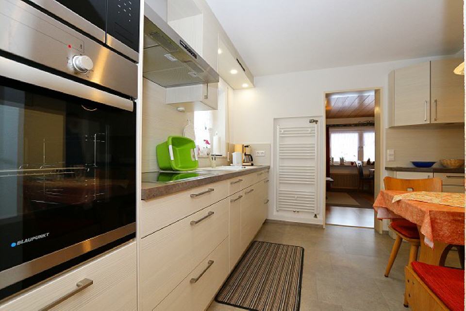 Küchenzeile mit E-Herd, Backofen, Mikrowelle, Kühlschrank, Geschirrsüler, Kaffeemaschine, Wasserkocher, Handtücher