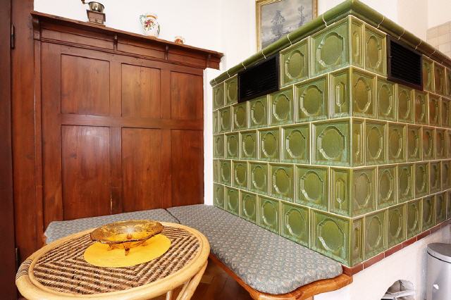 komplett eingerichtete Wohnküche mit Kachelofen