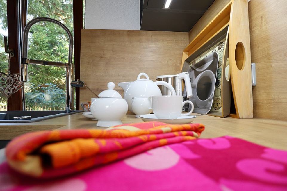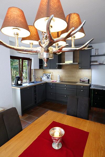 Küche: Esstisch für 6 Personen, Einbauküche, komplett eingerichtet, E-Herd mit großem Induktions-Ceranfeld, Spüle und Spülmaschine, Kühlschrank, Backofen, Microwelle, Kaffeemaschine, Wasserkocher, Toaster, Kachelofen