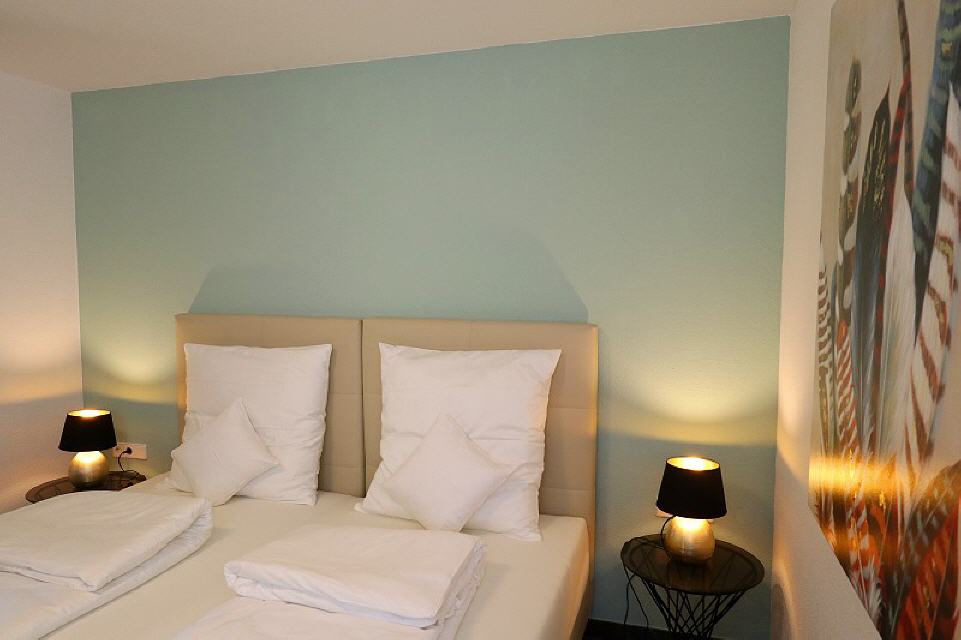 Schlafzimmer EG: Boxspringbett 2 x 2 m (teilbar), Nachttische, Nachttischleuchten, Kleiderschrank