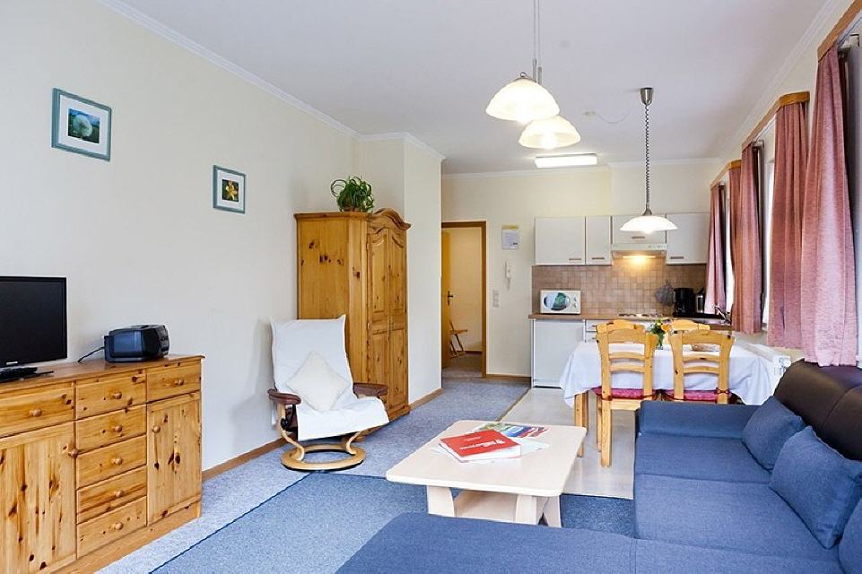 Wohn-/Esszimmer mit Küchenzeile: Komplett eingerichtete Küche: 4-Plattenherd, Backofen, Filterkaffeemaschine, Wasserkocher, Toaster, Mikrowelle, Mixe,Esstisch und 4 Stühle, Sofa, Wohnzimmertisch, SAT-TV, Radio mit CD-Player.