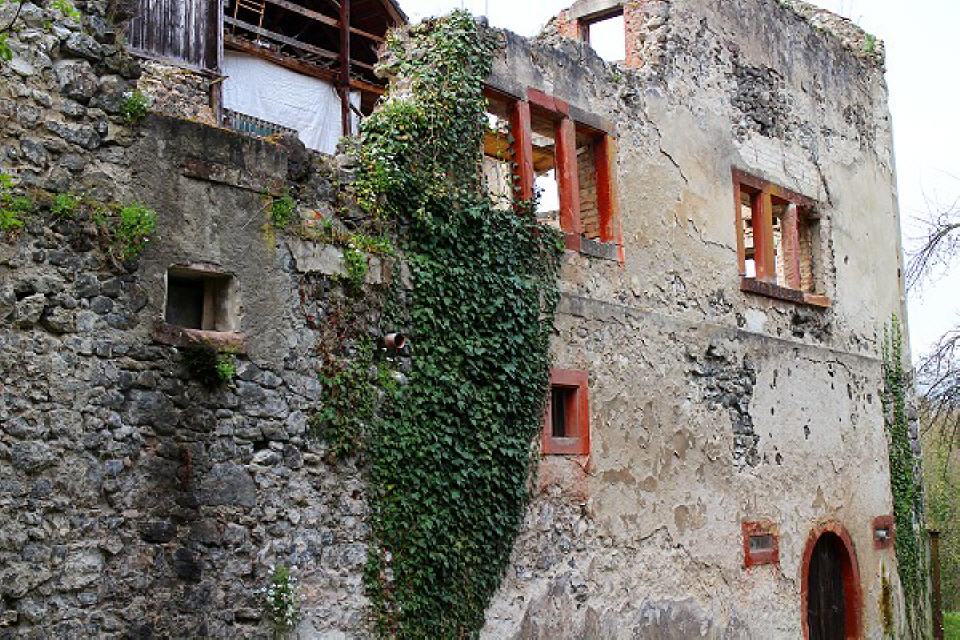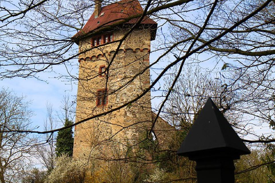 Wie ein erhobener Zeigefinger ragt an den Altrheinarmen zwischen den Auewäldern und den Westhängen des Kaiserstuhls der Bergfried der Burgruine Sponeck zum Himmel. Die Burg liegt südlich von Jechtingen bei Sasbach am Kaiserstuhl.