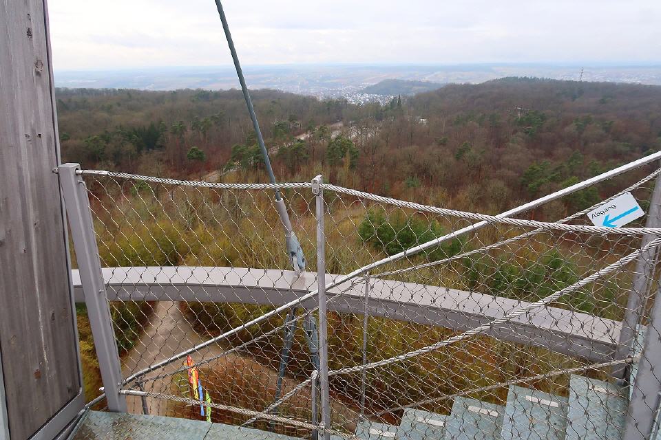 Getragen wird er von acht sich kelchartig aufspreizenden Masten aus verleimtem, heimischem Lärchenholz, die durch drei Aussichtsplattformen auf 10, 20 und 30 Metern Höhe unterbrochen sind. Die Masten sind durch ein Stahlseilnetz zum Fundament verspannt. Die Plattformen sind über zwei wendelförmige Stahltreppen zu erreichen.